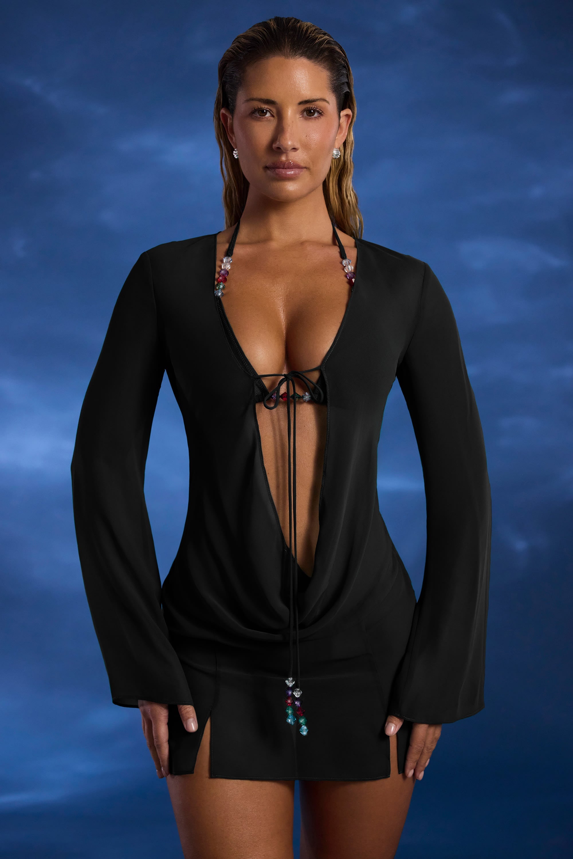 Nail the breezy beach aesthetic with our Vista mini dress. Crafted from sheer georgette to spotlight your favourite swimwear, it’s cut to a flirty, plunging cowl-neck silhouette complete with adjustable bead-embellished ties at the front for custom coverage. It’s framed with long flared sleeves and split detailing at the hem.